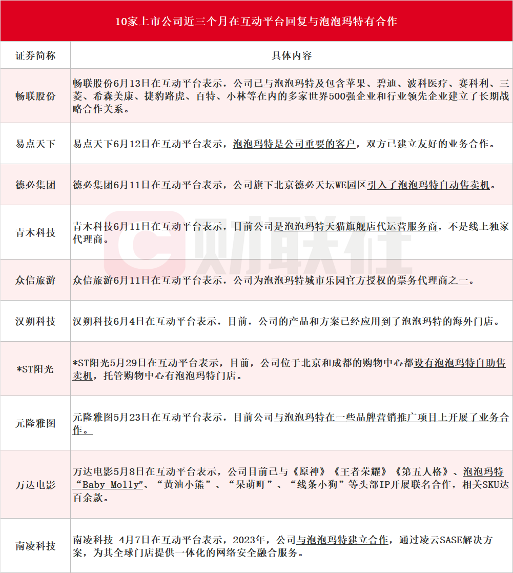 据不完全整理,畅联股份、易点天下、德必集团、青木科技、众信旅游、汉朔科技、*ST阳光、元隆雅图、万达电影和南凌科技在内的10家上市公司于近三个月在互动易回复与泡泡玛特有合作。